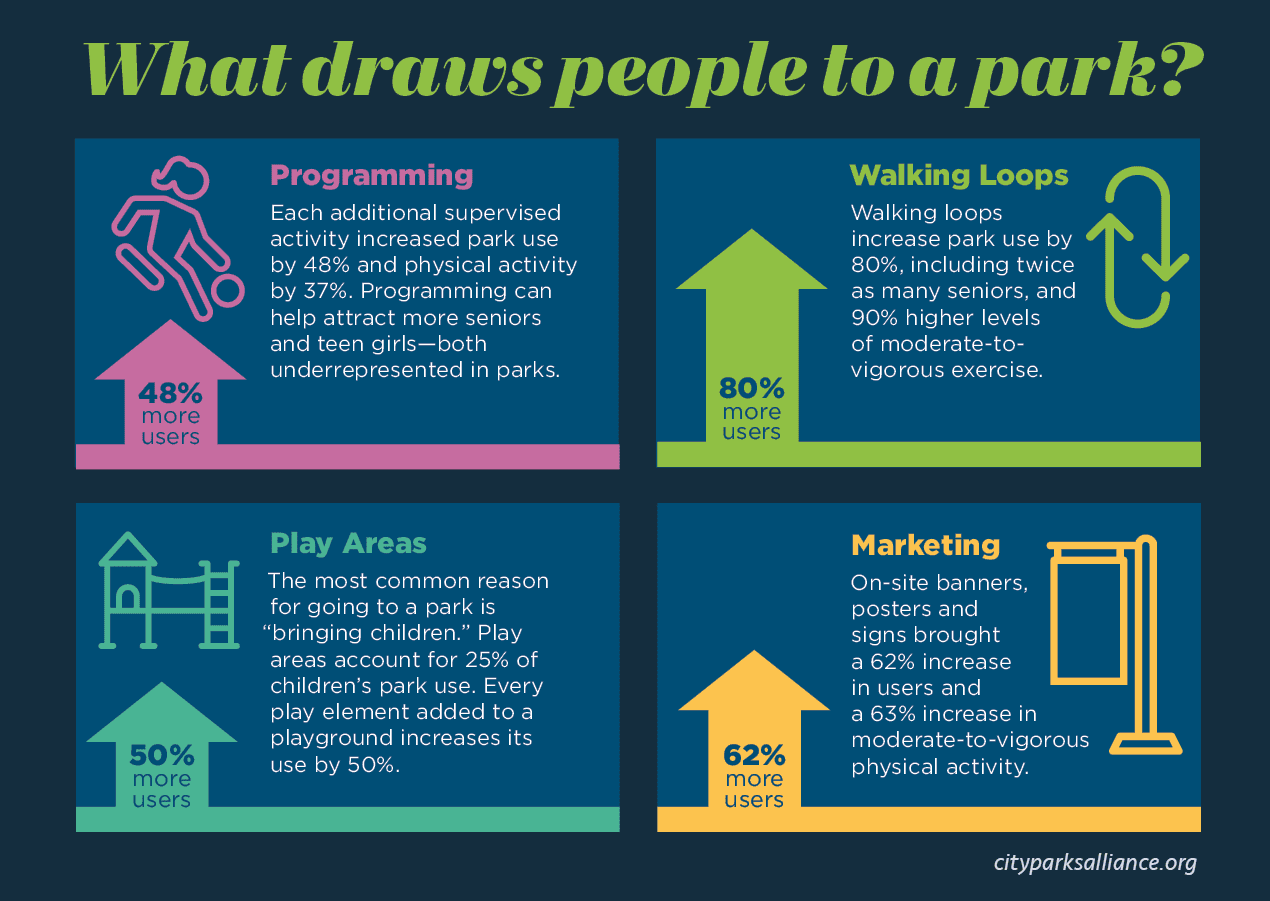 Active Parks, Healthy Cities distills these findings into four major recommendation categories: Programming, Design, Marketing and Outreach, and Measuring Park Use. The report curates multiple case studies for each of the four major findings from cities of different sizes and geographies for park and recreation professionals, health organizations, advocacy groups and others to replicate. #ActiveParks https://www.cityparksalliance.org/activeparks