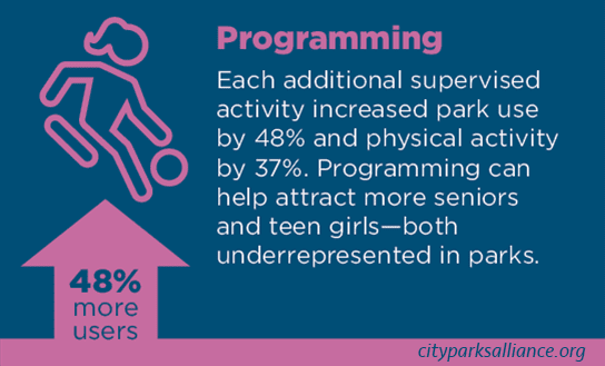 Active Parks, Healthy Cities distills these findings into four major recommendation categories: Programming, Design, Marketing and Outreach, and Measuring Park Use. The report curates multiple case studies for each of the four major findings from cities of different sizes and geographies for park and recreation professionals, health organizations, advocacy groups and others to replicate. #ActiveParks https://www.cityparksalliance.org/activeparks